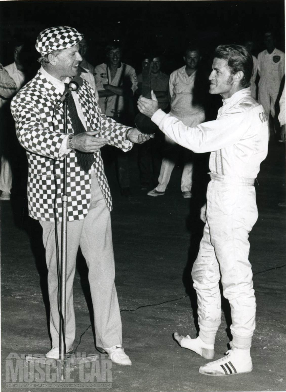 This milestone event drew the largest crowd ever seen at the Adelaide track. Once promoter Kym Bonython (below left) had squeezed in 20,000 paying customers, about twice his normal attendance, he was forced to lock the gates and call the police to control those still queuing on the streets. He recalls sitting there that night praying that the stepped terraces wouldn’t collapse under the weight of humanity.