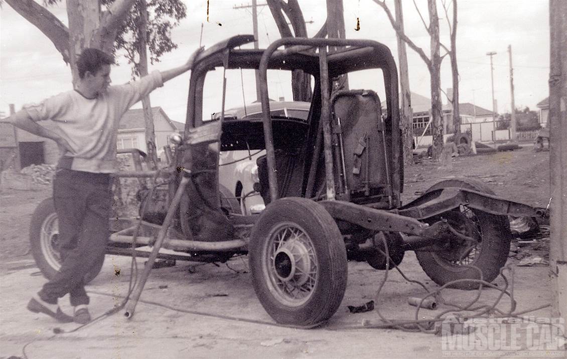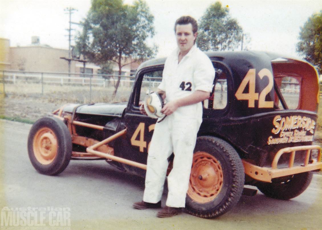 Morrie Mathews, apprentice panel beater and a bit of a bodgie, was a regular spectator at Tracey's Speedway until he decided to build up his own speedway Hot Rod. These cars were the big thing at the time, with over 30 turning up at the speedway most weeks. The earliest Australian stock cars were reinforced with barwork inside and out so they resembled mobile battering rams, but the Melbourne rods were built for speed.