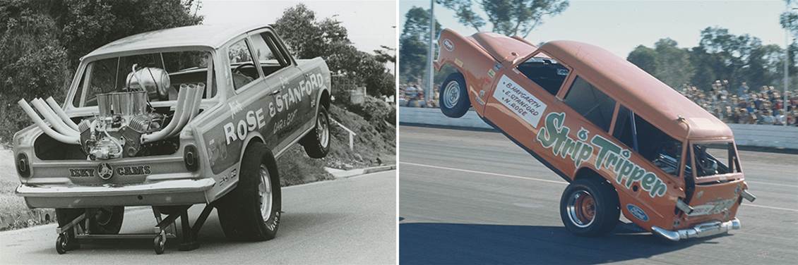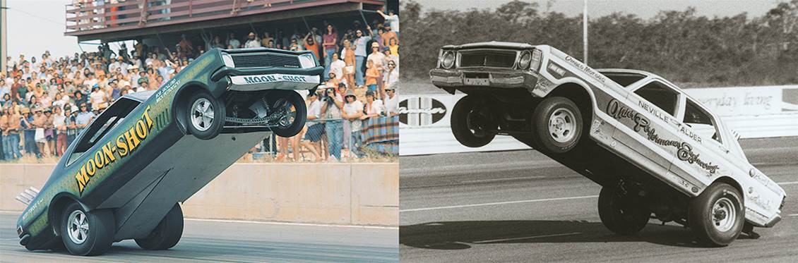 After Shrewsberry’s visit there was a bit of an Australian wheelstander fad. Local racers realised that the easiest way to make cars sit up and beg was to stick the motor in the boot. VW Kombis, FB station wagons and Mustangs were all converted but the most spectacular was the Moon-Shot Monaro, driven by Bob Skoglund and Mick Petrowsky. Powered by a Chrysler Hemi, it began its life as the famous Shaker Funny Car.